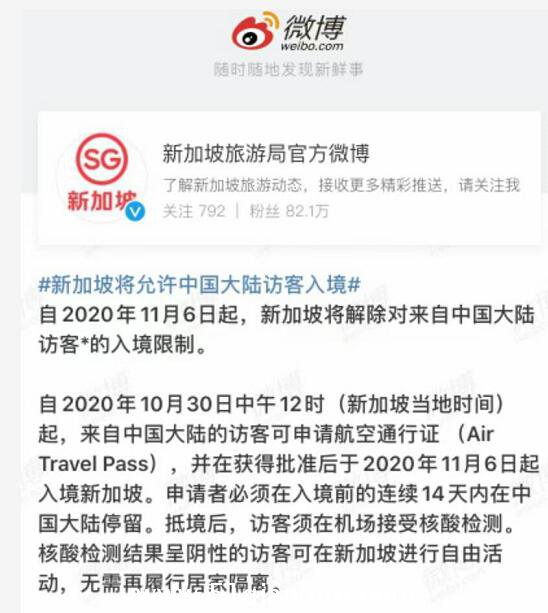 可以2020年注定是一个不平凡的年,大家都在战胜新冠,都在努力的将自己活下去。自从去年2019年疫情爆发后很多国家都对我们封国,不允许中国人前往。发展至今疫情仍在世界上其他国家肆虐,我们国家是控制的最好的,为此现在很多国家对我们的封国政策正在逐步的解开。包括最先对我们采取措施的新加坡也于2020年11月6日对我们解除限制。具体消息我们可以前往新加坡驻华使馆官网查看下图也是他们官方微博发布的通知。
